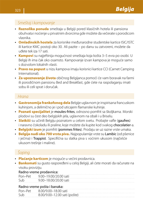 Konverzacija je podeljena po temama i pruža pregled vokabulara i fraza koje će vam biti od koristi u najrazličitijim situacijama (pozdravi, brojevi, određivanje vremena, predstavljanje, putovanje (kolima, avionom, vozom, gradskim prevozom), smeštaj, hrana, sport, upoznavanje, obilazak grada, šoping, nepredviđene situacije, porodica, posao, banka...). Sve ove teme su upakovane u vrlo praktičan format, spreman da vam uvek bude pri ruci.