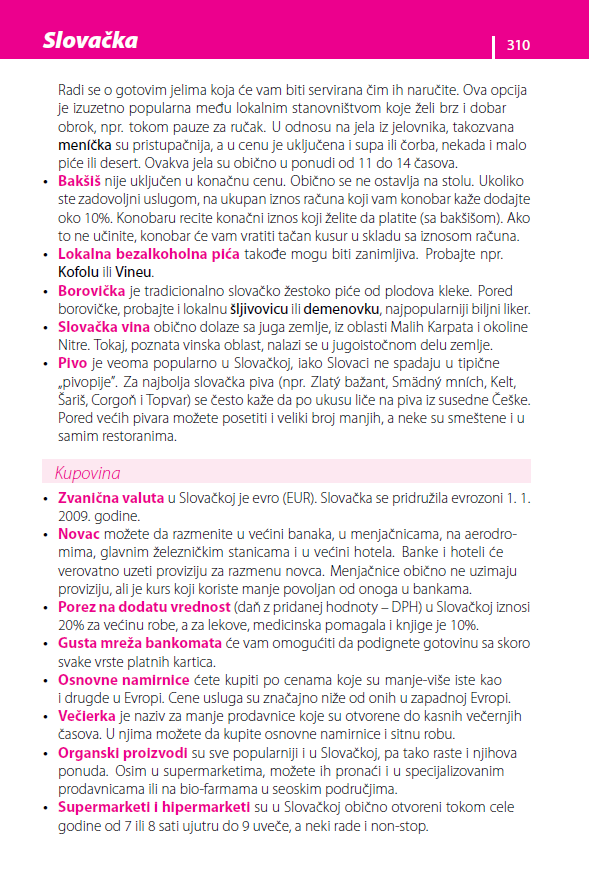 Knjiga uključuje i obostrani rečnik sa najčešćim odrednicama, a za brže pronalaženje tema je tu indeks. Na kraju knjige se nalaze različite praktične informacije o Slovačkoj, npr. informacije o carinskim i viznim uslovima, putnim propisima i ograničenje brzine na putevima. Priručnik je takođe proširen sažetim pregledom gramatike zahvaljujući kojem možete dodatno produbiti svoje znanje jezika.